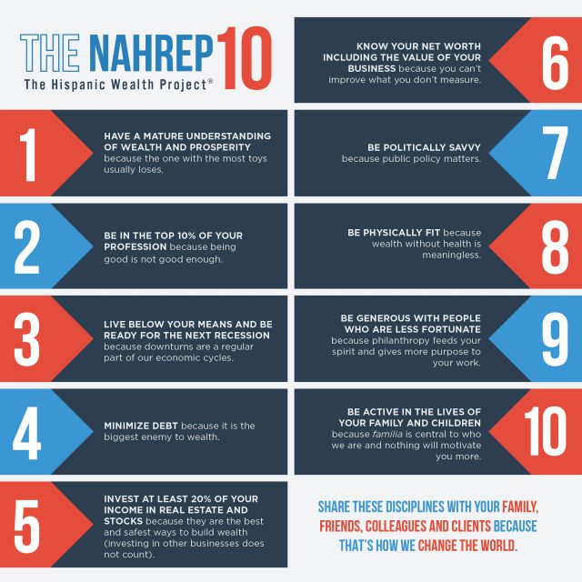 NAHREP’s Hispanic Wealth Project shares 10 principles for their members and the people they influence.